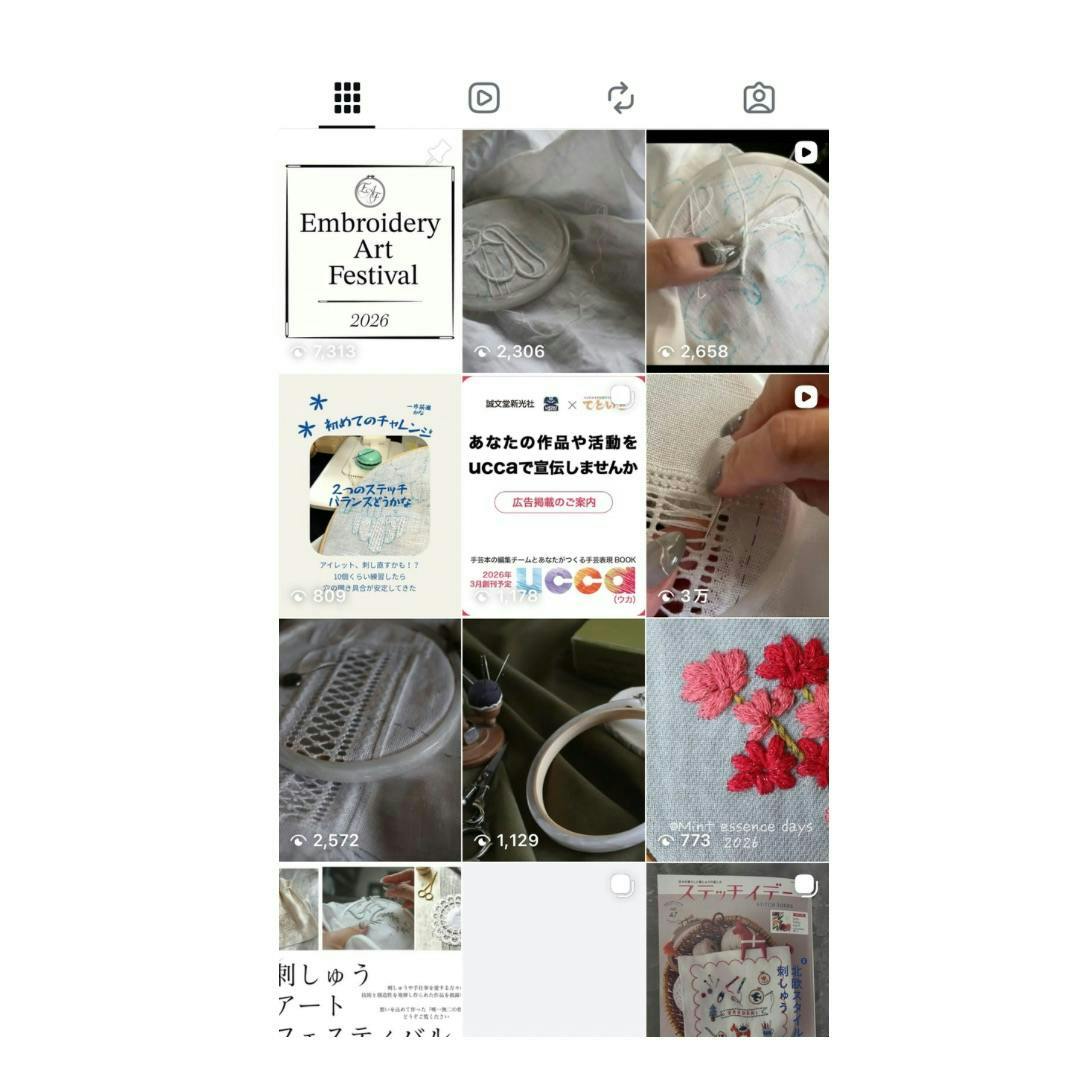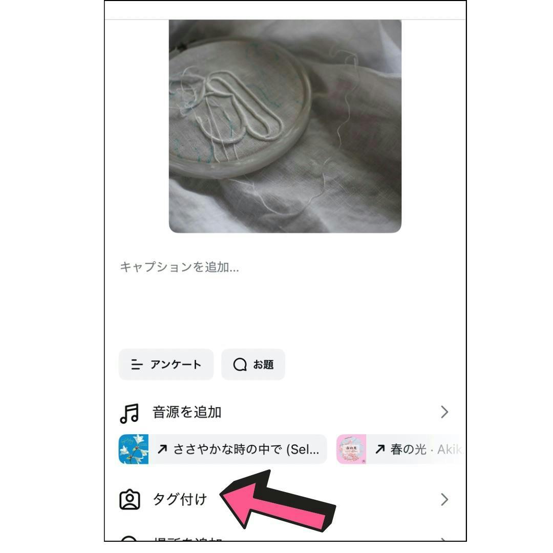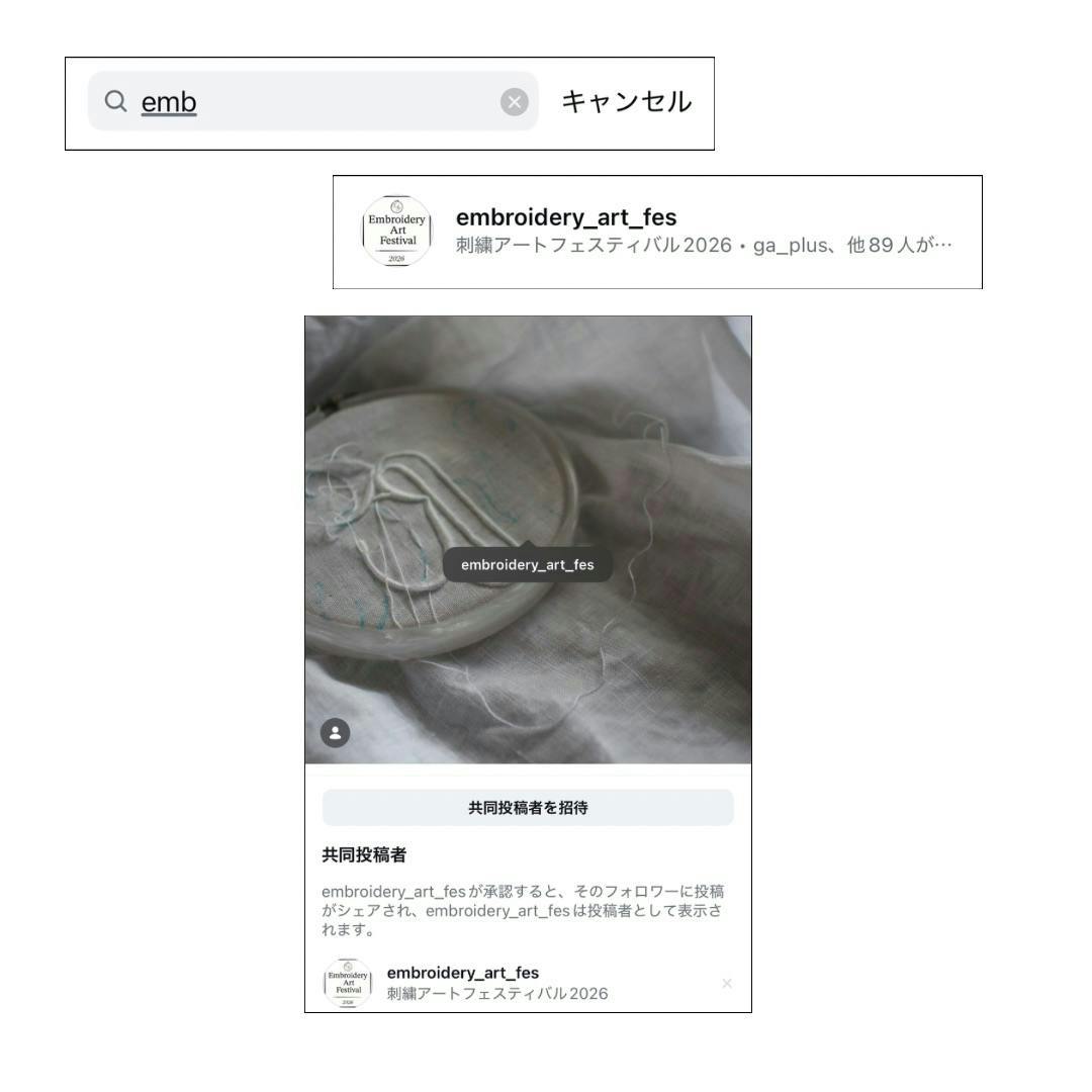 ?で「embroidery」と入力するし、「刺繍アートフェスティバル」のアカウントを選択し、そのあとは普段通り投稿してください。